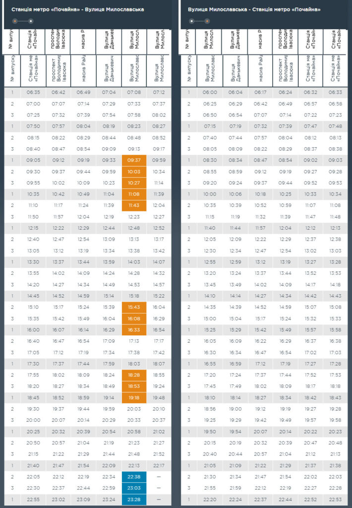 - Кінцеві пункти: ст. м. «Почайна» / Станція «Зеніт» ↔ вул. Милославська (Троєщина).
