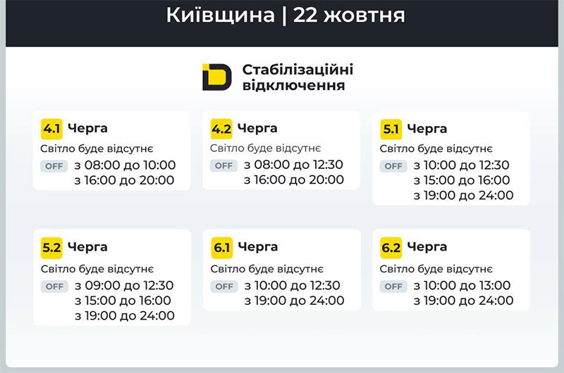 - Черги 5.1, 5.2, 6.1: не буде світла з 19:00 до 22:30