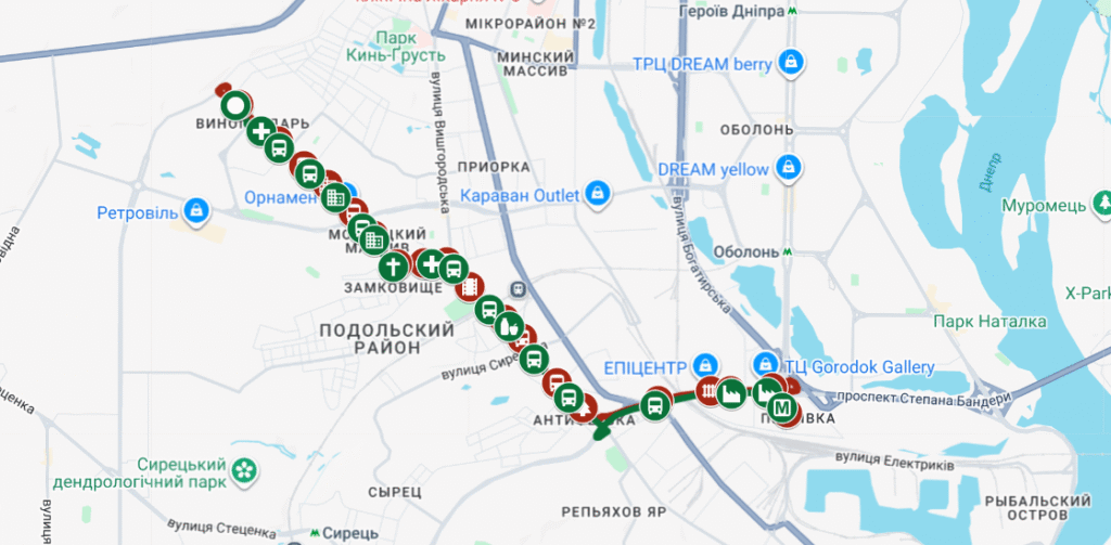 - Маршрутка проходить повз кілька великих торгових центрів і ринків.