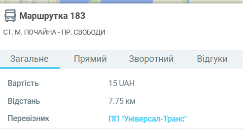Маршрутка №183 курсує між станцією метро «Почайна» та проспектом Свободи. Вона з’єднує Оболонський і Подільський райони міста. Курсування здійснюється щодня зранку й до вечора. Далі — коротка та зрозуміла інформація про маршрут.