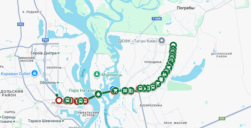 Маршрутка починає роботу з метро Почайна о 6:20 ранку. Перетинає Поділ, Оболонь та інші райони Києва. Завершує останній рейс на вулиці Милославська о 22:00. Довжина маршруту становить близько 18 км, а час у дорозі в середньому — 60 хвилин.