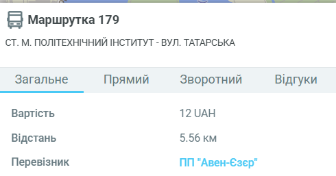 Маршрутка № 179 у Києві з’єднує станцію метро «Політехнічний інститут» із вулицею Татарською. Вона курсує щодня, забезпечуючи швидке та зручне сполучення між Шулявкою та Солом’янкою. Поїздка триває близько 20 хвилин. Інтервал між маршрутками — від 8 до 15 хв. Проїзд коштує 12 гривень.