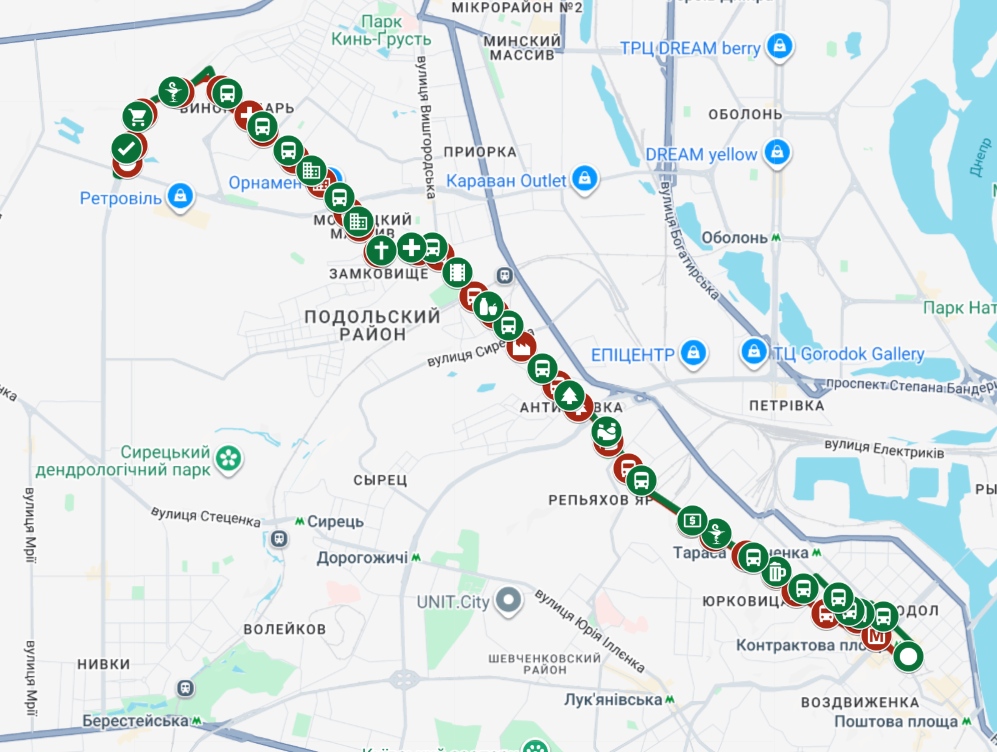 Маршрутка відправляється від станції метро «Контрактова площа» й прямує до мікрорайону «Синьоозерний». По дорозі вона оминує найжвавіші вулиці Подолу та перелічені нижче зупинки: