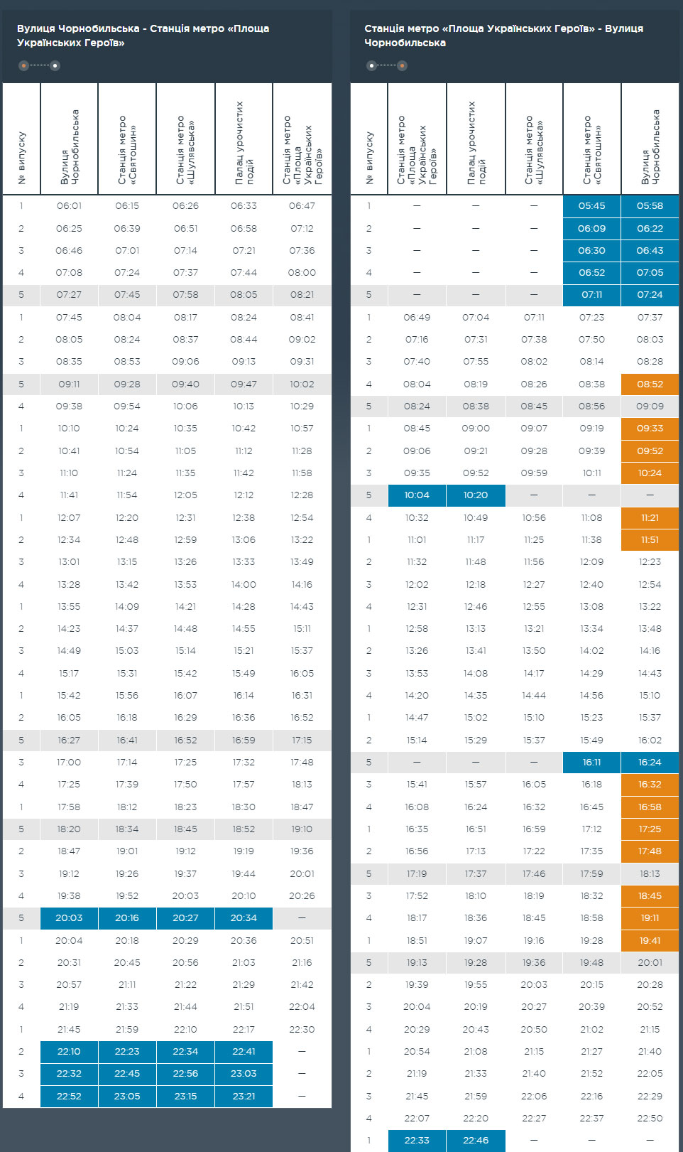 Маршрут курсирует ежедневно, основной график — примерно с 07:00 до 21:10, интервалы между рейсами — 20–34 мин. Однако ранние рейсы могут стартовать уже около 06:10, а вечерние — продолжаться до 22:57, интервалы днем — 18–23 мин. В будние ранние часы могут быть больше интервалов, тогда как в часы пик интервал сокращается до 7–10 мин, днем — 12–15 мин, вечером — до 20 мин. Рекомендуем использовать мобильные приложения для уточнения в реальном времени. Самую свежую информацию можно найти на этих сайтах: Киевпастранс и EASYWAY Киев