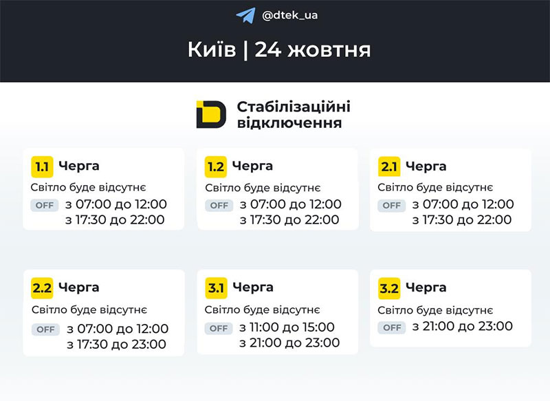 В Киеве шесть основных очередей, каждая из которых имеет подчерки — например, 1.1, 1.2, 2.1, 2.2 и т.д. Если в вашей группе свет выключен вне графика — это, скорее всего, аварийное отключение из-за перегрузки.