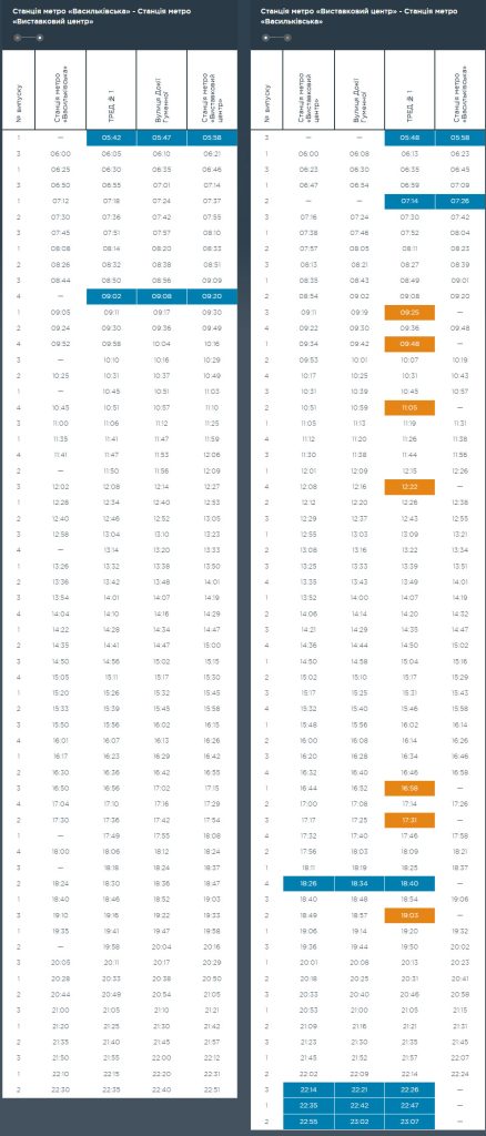 - кінцеві: ст. м. «Виставковий центр» – ст. м. «Васильківська»;