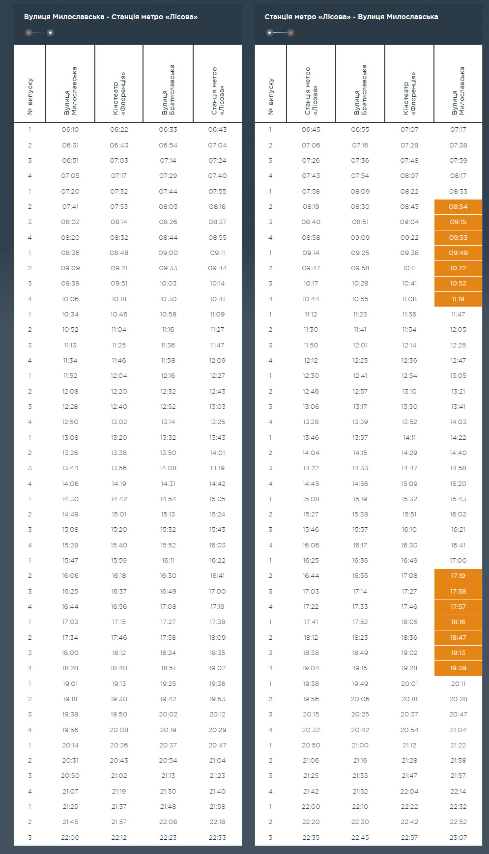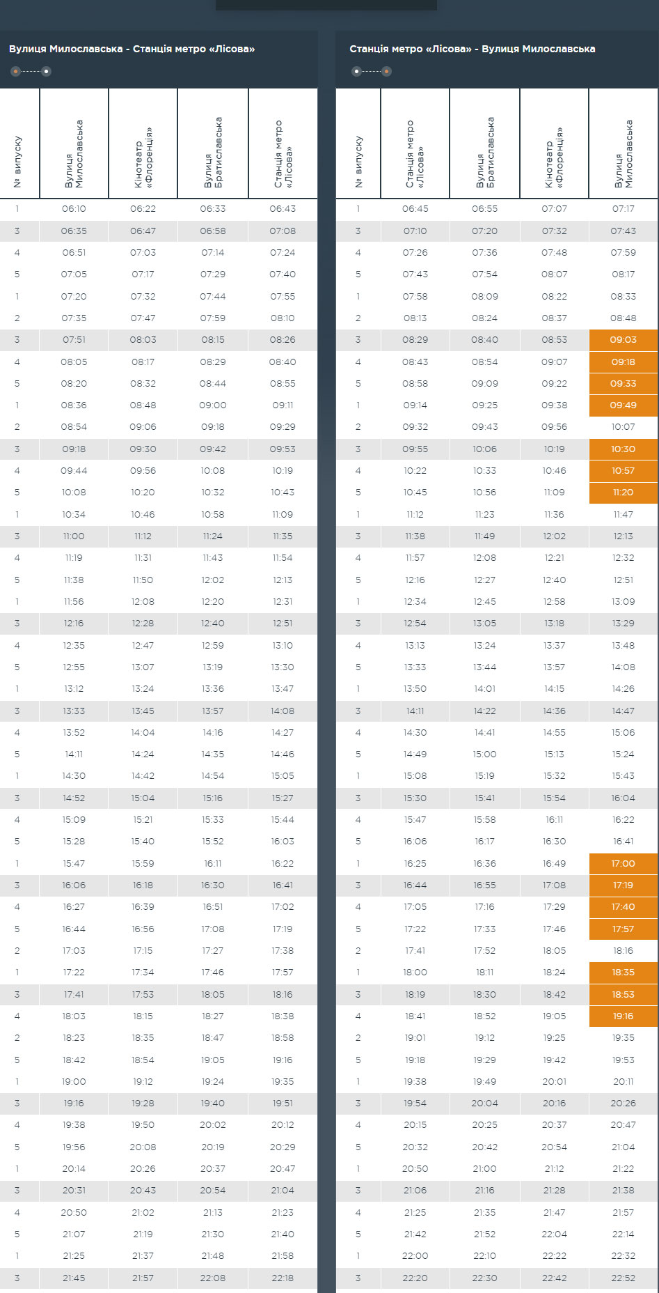 Початок руху | 06:50 (з вул. Милославська) / 06:10 (зі ст. м. «Лісова») |