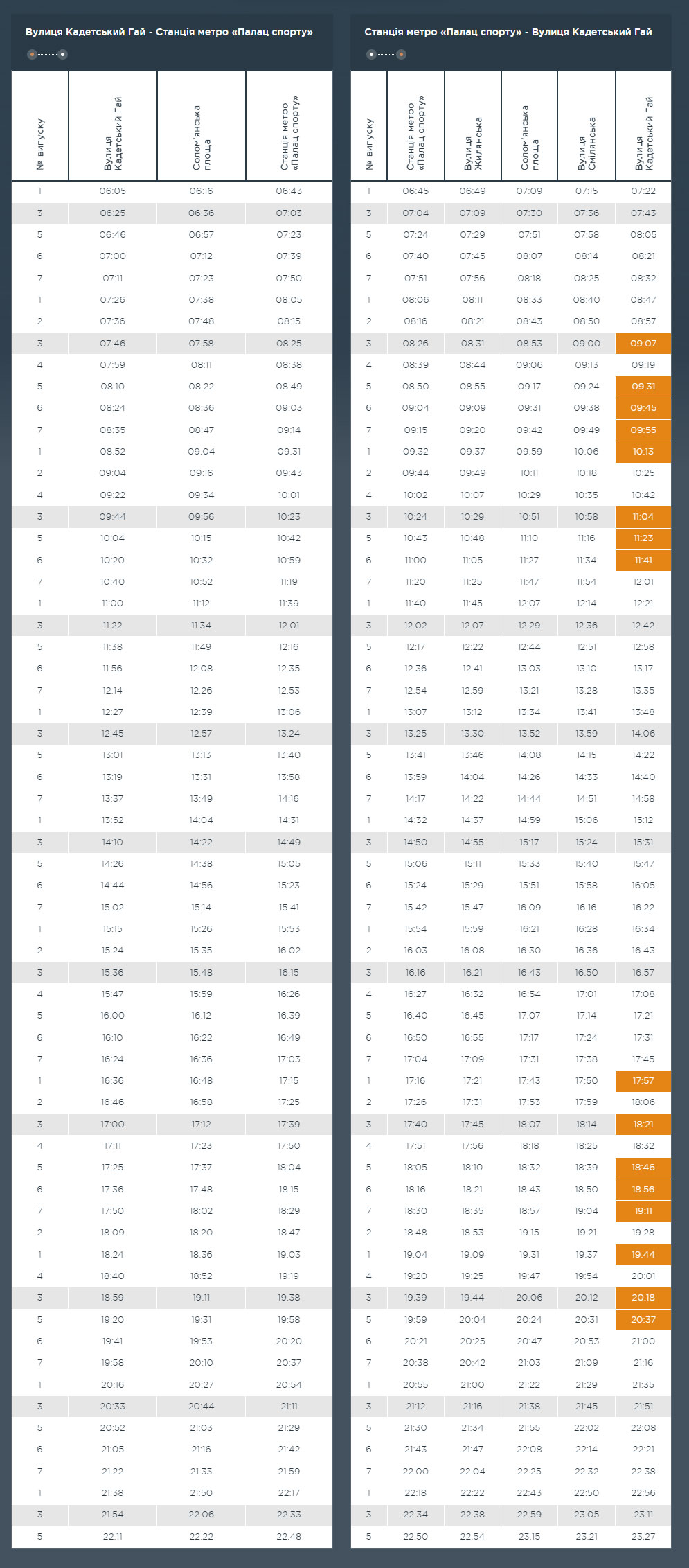 Останнє відправлення | 21:50 (з вул. Кадетський Гай) / 21:10 (зі ст. м. «Палац спорту») |