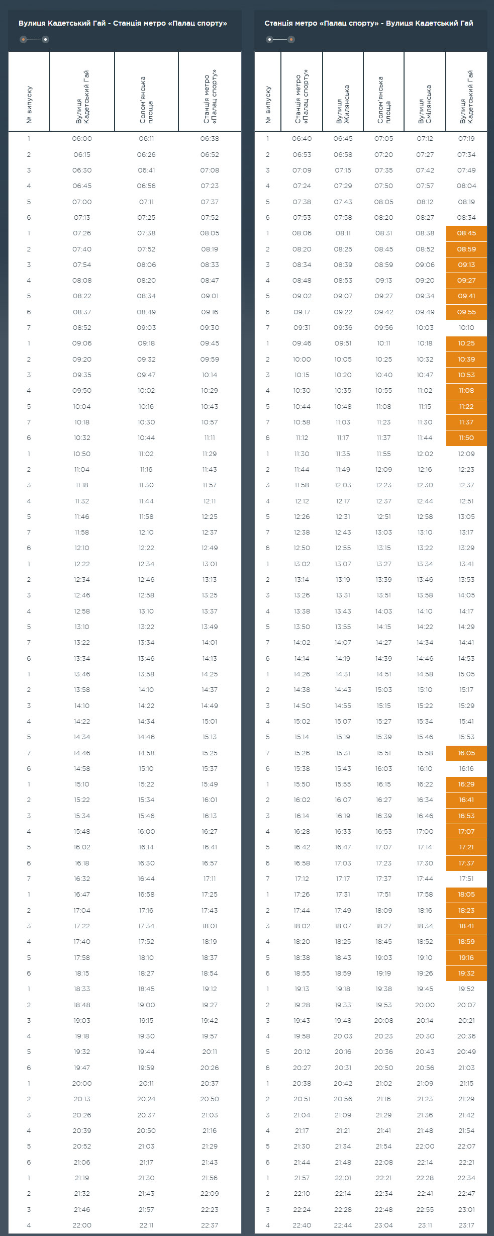 Початок руху | 06:38 (з вул. Кадетський Гай) / 06:00 (зі ст. м. «Палац спорту») |